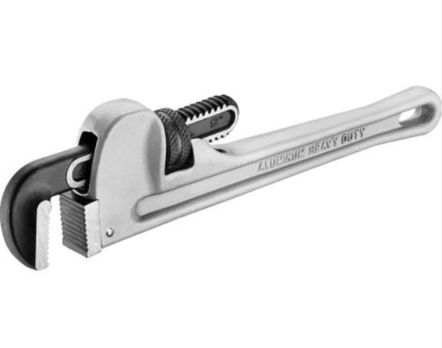 Lightweight aluminium pipe wrench. One hand operation leaving the other hand free.